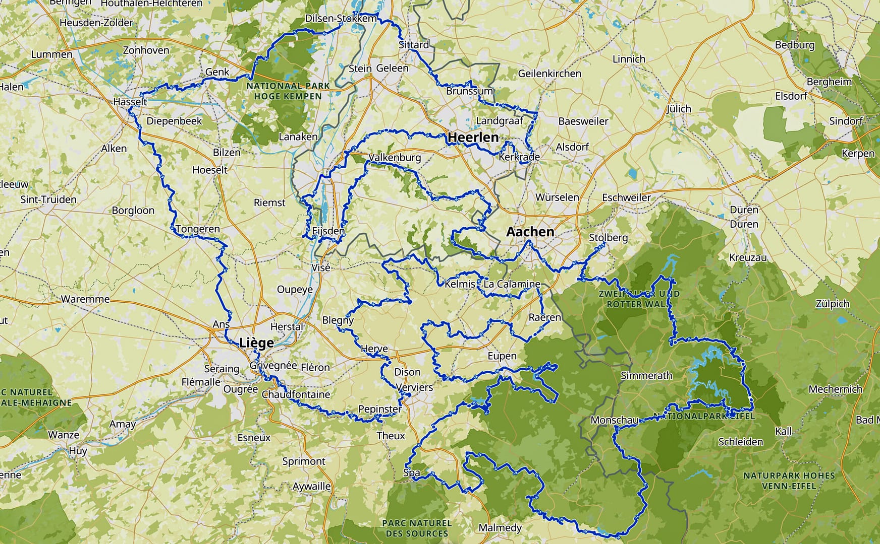 Déze langeafstands wandelroute ligt in het hart van de Euregio Maas-Rijn, tussen de steden Maastricht (NL), Genk (BE), Hasselt (BE), Luik (BE), Eupen ( BE) en Aken (DE).